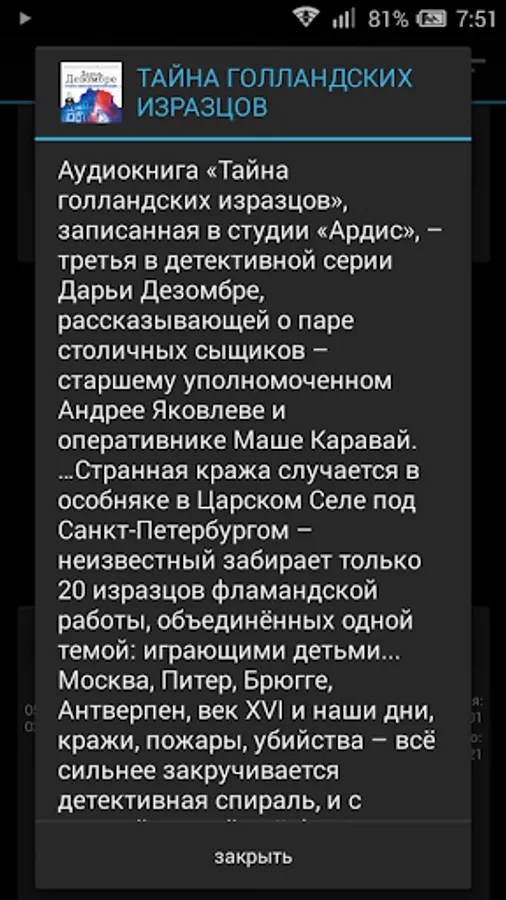 Audiobook "The Mystery of Dutch tiles", recorded in the studio "Ardis" - the third in a series of detective Darya Dezombre telling about a pair of detectives of the capital - authorized senior Andrei Yakovlev and operatives Masha Loaf. ... The strange case of theft in a family house in Tsarskoye Selo near St. Petersburg - the unknown takes only 20 tiles Flemish works, united by one theme: children playing ... Moscow, St. Petersburg, Bruges, Antwerp, Century XVI and nowadays, theft, fires, murders - all the more twisted detective spiral, and with every book becomes more and more fans of the author.