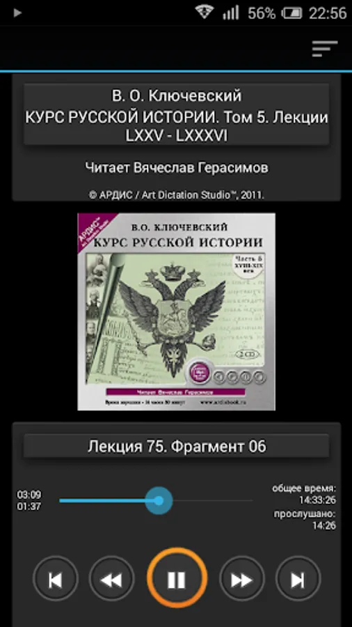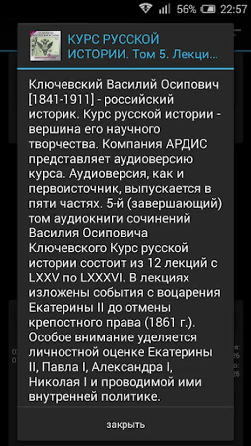 5th (final) is an audiobook works Vasily Klyuchevsky "The course of Russian history" consists of 12 lectures on LXXV LXXXVI. The lectures presented events from the reign of Catherine II to the abolition of serfdom (1861). Particular attention is paid to the personal assessment of Catherine II, Paul I, Alexander I, Nicholas I and pursued their internal politics.