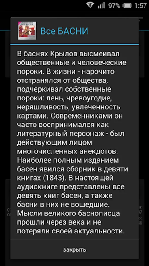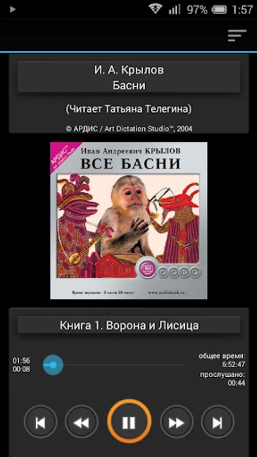 In fables Krylov derided public and human defects. In life - deliberately excluded from society, she underlined their own vices: sloth, gluttony, negligence, passion cards. Contemporaries, he was often perceived as a literary character - was protagonist of many anecdotes. The most complete edition of a collection of fables appeared in nine books (1843). This audiobook presents all nine books of fables and fables are not included in them. Thoughts of the great fabulist have passed through the centuries and have not lost their relevance. Listen to them