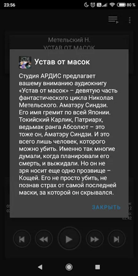 ARDIS Studio brings to your attention the audiobook "Tired of Masks" - the ninth part of the fantastic cycle of Nikolai Metelsky. Amateru Shinji. His name is thundering all over Japan. Tokyo Dwarf, Patriarch, Witcher of the rank of Absolute - this is also him, Amateru Shinji. And this is just a person who can be killed. This is exactly what many thought when they planned his death and waited. But it is not for nothing that he bears another nickname - Koschey. It is not easy to kill him without knowing the fear of the very last mask behind which he was hiding.