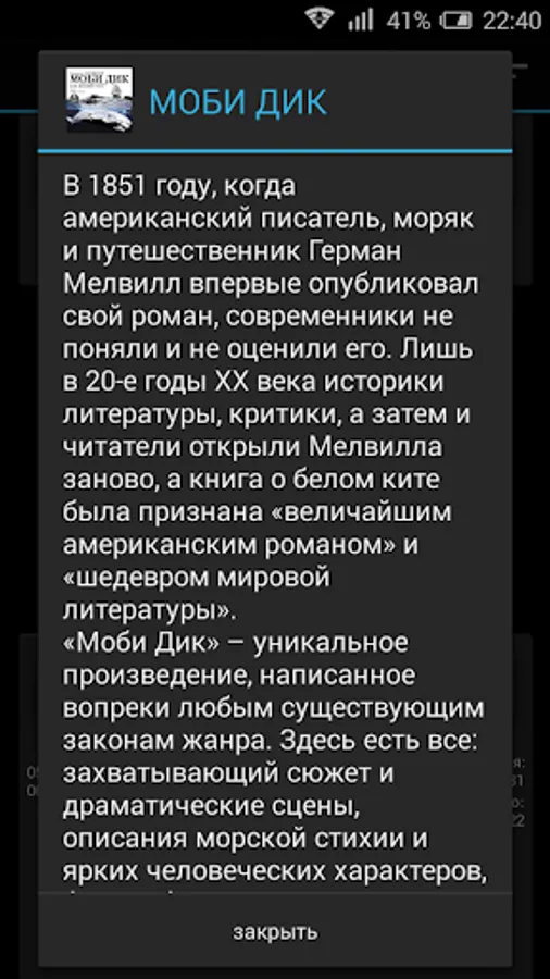 "Moby Dick" - unique work written in spite of any existing laws of the genre. It has everything: exciting plot and dramatic scenes, descriptions of sea elements and vivid human characters, philosophical digressions and dialogues, poetic paintings and scientific reasoning. The reality of whaling, making the novel a kind of "whale encyclopedia", interspersed with arguments having the second, symbolic meaning.