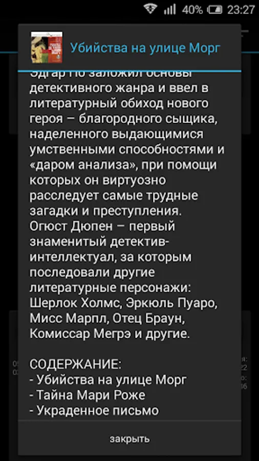 ... The house in the Rue Morgue, two female corpses found. The police have no motive, no evidence of this mysterious crime. One thing is clear: the killer is not only possesses superhuman strength, but also is able to dissolve in the fog of the night ... And then the cause is taken one of the best detectives of France Auguste Dupin. He skillfully untangles knots and gathers all the puzzle pieces into a coherent whole ...
