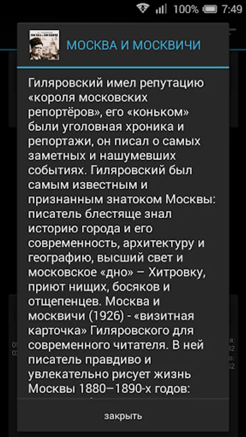 Giljarovsky had a reputation as "the king of reporters in Moscow," his "forte" were criminal and Chronicle reports he wrote about the most notable and high-profile events. Giljarovsky was the most famous and recognized expert in Moscow: the brilliant writer knew the history of the city and its modernity, architecture and geography, the highest light and Moscow "bottom" - Khitrovka, shelter beggars, tramps and renegades. "Moscow and Muscovites" (1926) - "calling card" Gilyarovskogo for the modern reader. In it the writer is truly exciting and draws life in Moscow 1880-1890-ies: the manners and customs, markets and slums, bookstores, spas and restaurants, streets and avenues, artists, merchants, officials ...