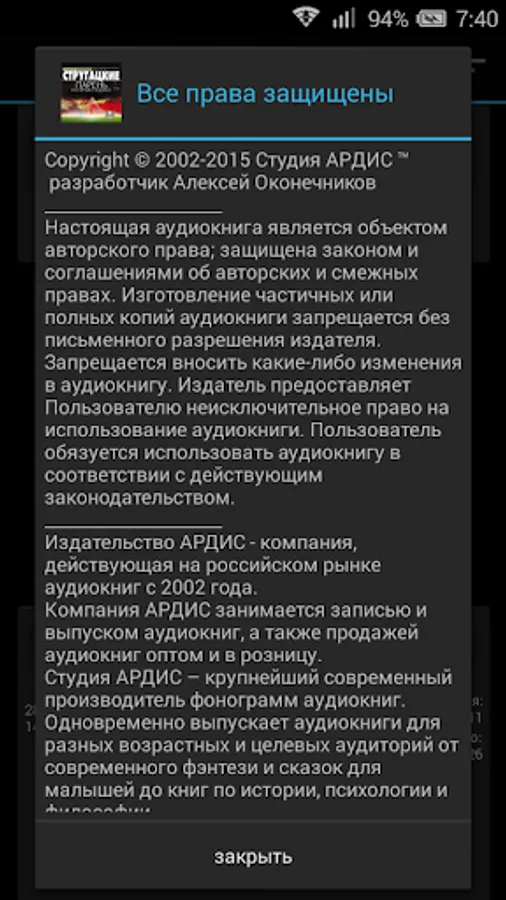 Making partial or complete copies of the audiobook is prohibited without written permission of the publisher. It does not make any changes in the audiobook. Publisher grants the User a non-exclusive right to use audiobooks.