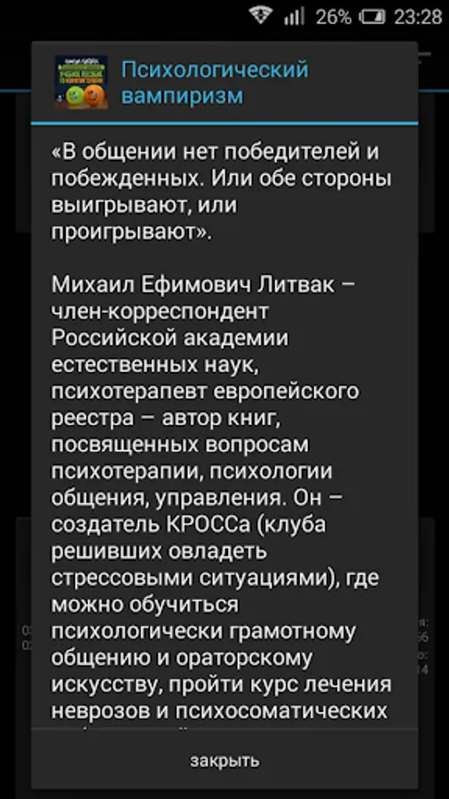 Mikhail E. Litvak - Corresponding Member of Russian Academy of Natural Sciences, the therapist European registry - author of books devoted to the issues of psychotherapy, psychology, communication, control. He - the creator Cross (the club decided to master stressful situations), where you can learn to psychologically competent communication and public speaking skills, to undergo treatment of neuroses and psychosomatic diseases.