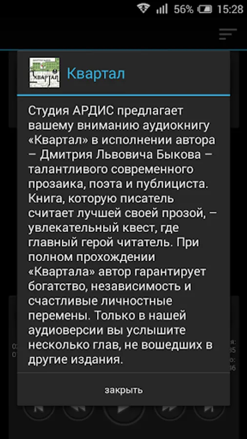 ARDIS studio offers you the audiobook "Quarter" performed by the author - Dmitriya Lvovicha Bykova - talented contemporary novelist, poet and essayist.