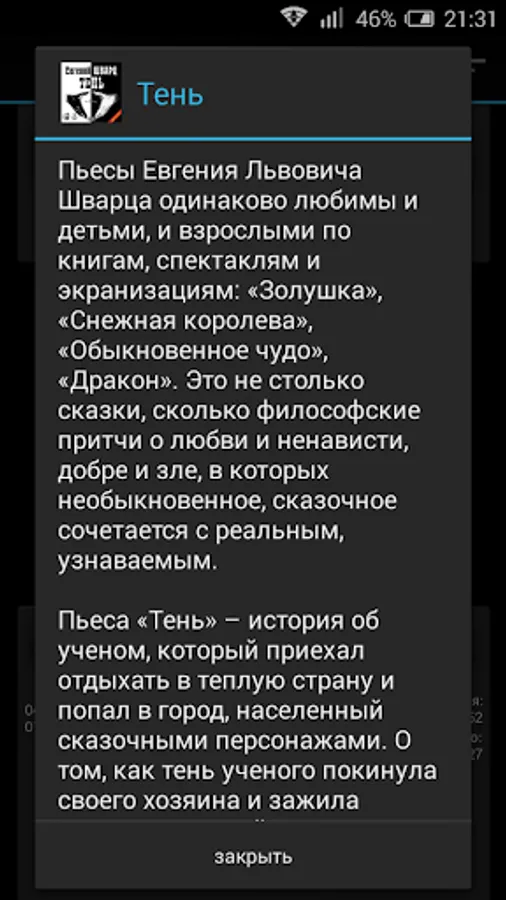 The play "The Shadow" - a story about a scientist who had come to rest in a warm country and hit the city, populated by fairy tale characters. To learn how to shadow a scientist left his master and healed an independent life. The story of betrayal and friendship with acute grotesque plot and philosophical overtones, full of sparkling humor, aphorisms and winged phrases.