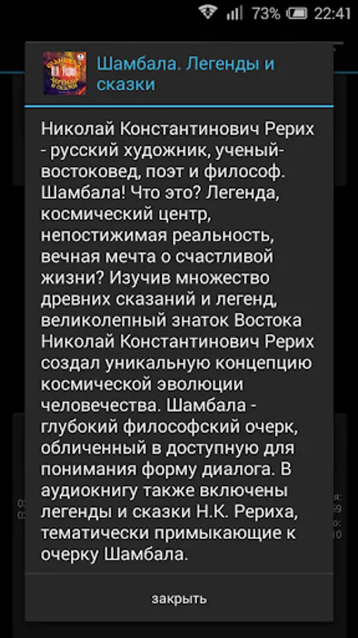 Nicholas Roerich - Russian artist, scientist-orientalist, poet and philosopher. Fenugreek! What is it? Legend, Space Center, unfathomable reality, the eternal dream of a happy life? Having studied many ancient tales and legends, a great connoisseur of the East Nicholas Roerich created a unique concept of cosmic evolution of mankind. "Shambala" - deep philosophical essay, denounced in an intelligible form of dialogue. The audiobook also includes legends and fairy tales NK Roerich, thematically adjacent to the essay "Shambala".
