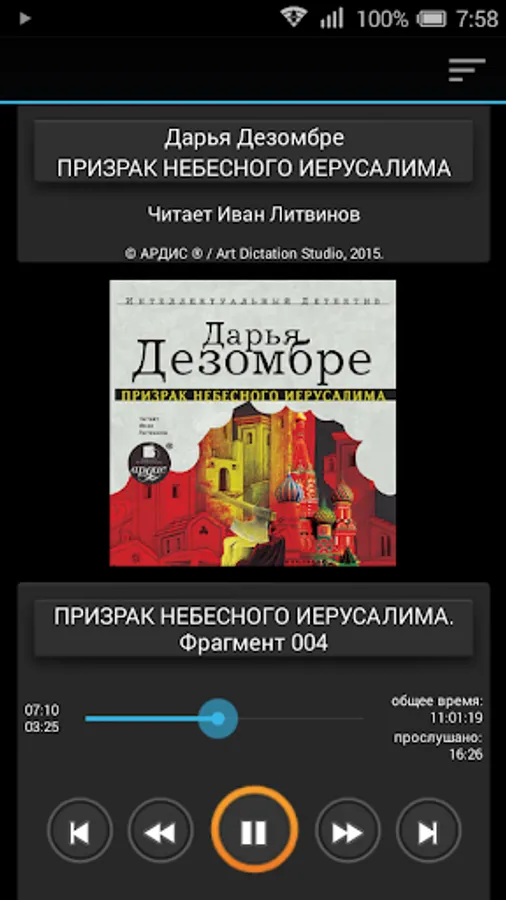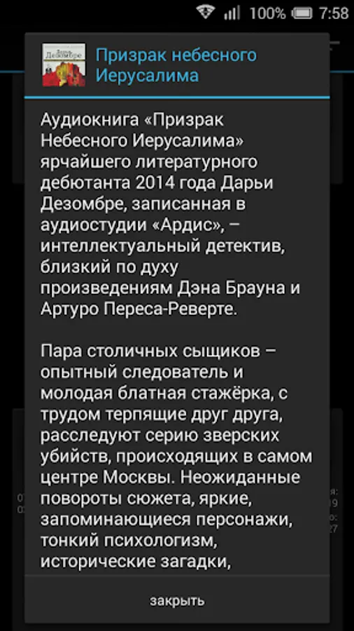 Audiobook "The Phantom of the heavenly Jerusalem," the brightest literary debutant 2014 Darya Dezombre recorded in audiostudiyu "Ardis" - an intellectual detective story, close in spirit to the works of Dan Brown and Arturo Perez-Reverte. A pair of detectives of the capital - an experienced investigator and young thieves stazhёrka, barely tolerate each other, are investigating a series of brutal murders that take place in the center of Moscow. Unexpected plot twists, colorful, memorable characters, subtle psychological, historical mysteries, mystical symbols on the background of modern, but the ancient city, a maniac, leaving bloody nicks in the city center, allow us to attribute the novel to the genre of psychological thriller.