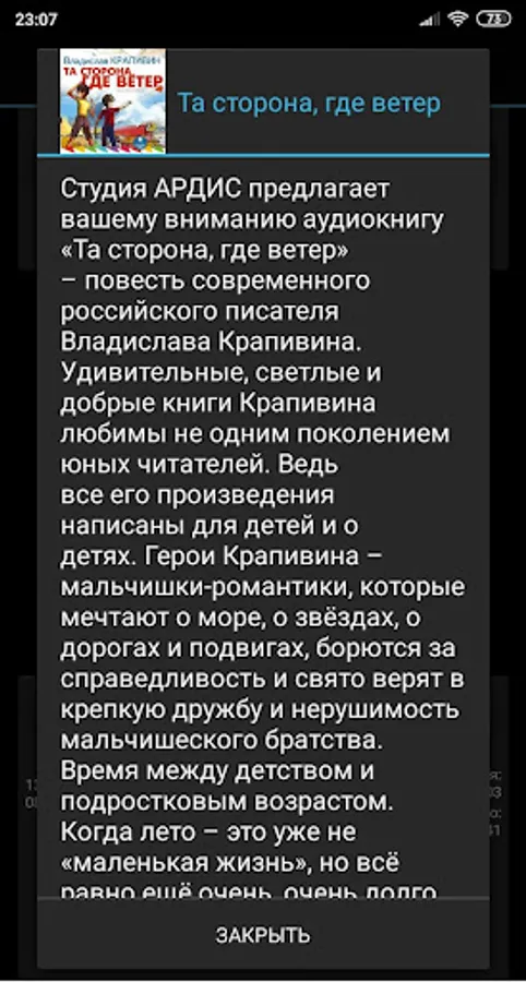 The ARDIS Studio offers you the audiobook “The Side Where the Wind Is” - the story of the modern Russian writer Vladislav Krapivin. Amazing, bright and good books Krapivin loved by more than one generation of young readers. After all, all his works are written for children and about children. The heroes of Krapivin are romance boys who dream of the sea, the stars, the roads and exploits, fight for justice and firmly believe in strong friendship and the inviolability of the boyhood fraternity.