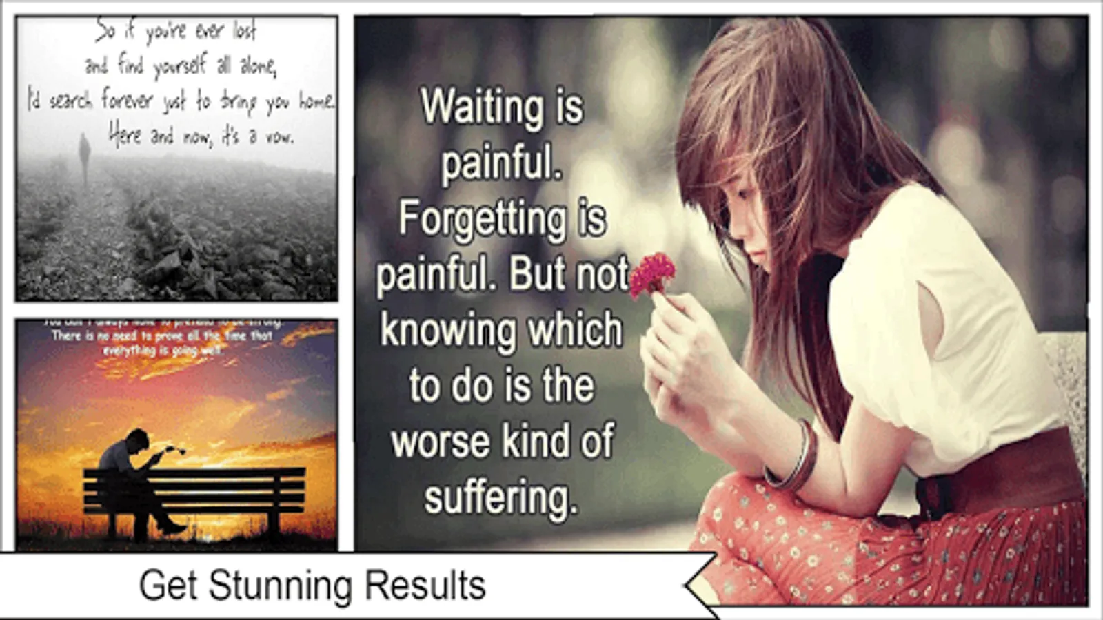 When you're feeling depressed and sad sometimes is just makes it worse to fake a smile It's okay to be yourself and let the world see that you're not perfect While the wallpapers in this app reflect your sadness and hurting they also serve another purpose they remind you that you are not alone in your suffering There are many other souls out there who know the pain and loneliness of depression or a broken heart Take comfort in the refreshing honesty of these heartwrenching wallpapers Each wallpaper in this app features a beautiful or meaningful background paired with a quote about struggling against your own mind and emotions
