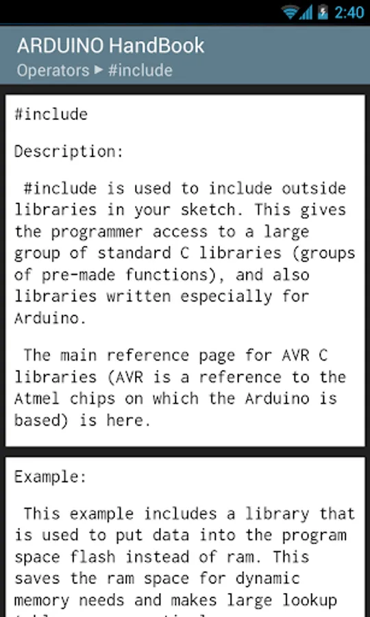 The application gives to you OFFLINE mobile handbook under Arduino. The handbook is aimed at beginners and advanced developers of Arduino.
