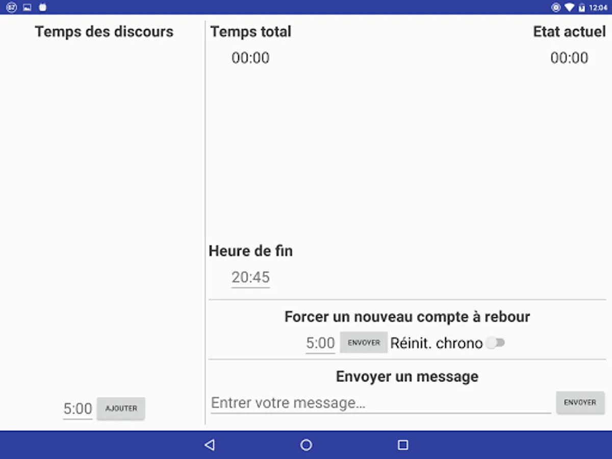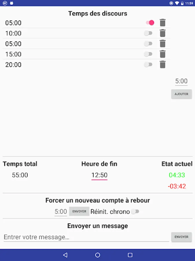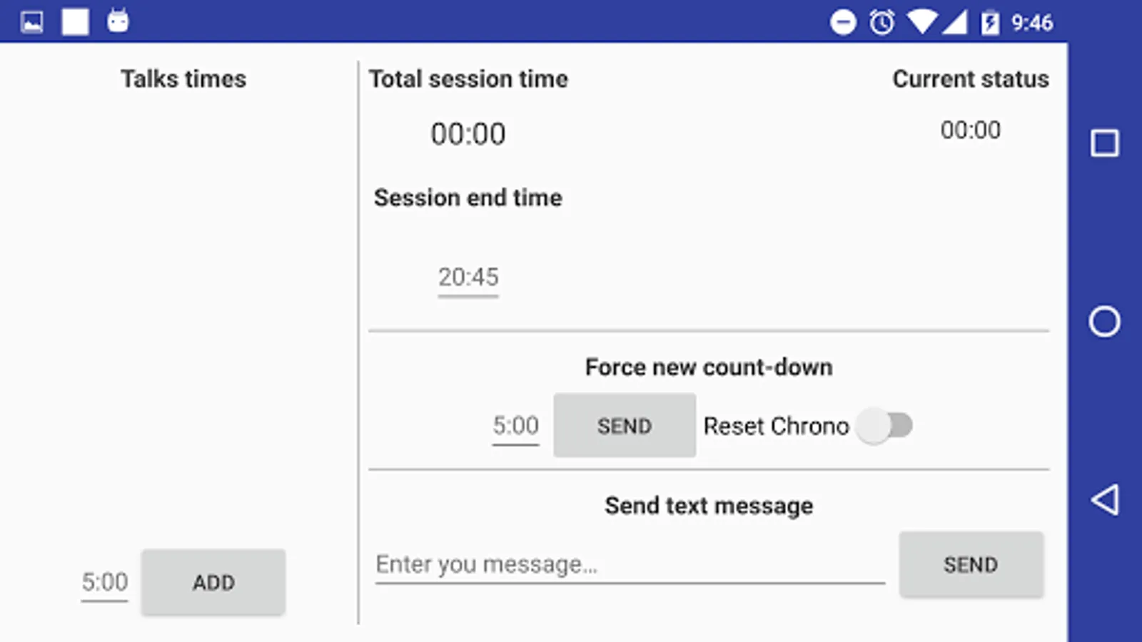 The server part defines a list of talk times and the ending hour of the session. The app calculate the advance or delay. The server user sends new countdown times at the beginning of each talk and can also send text message to the speaker. The new countdown time integrate the delay proportionally to end the session on time.