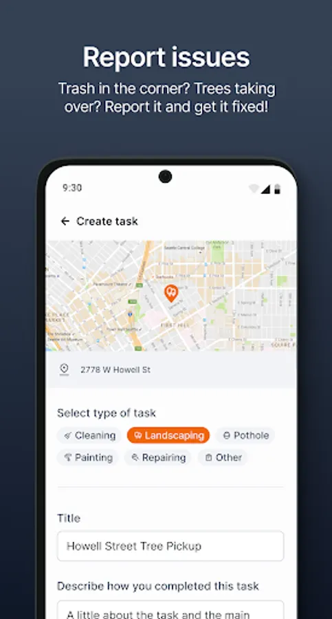 Reporting issues is super easy, just point to where the problem is on a map, enter some basic information and a picture, and you are done!