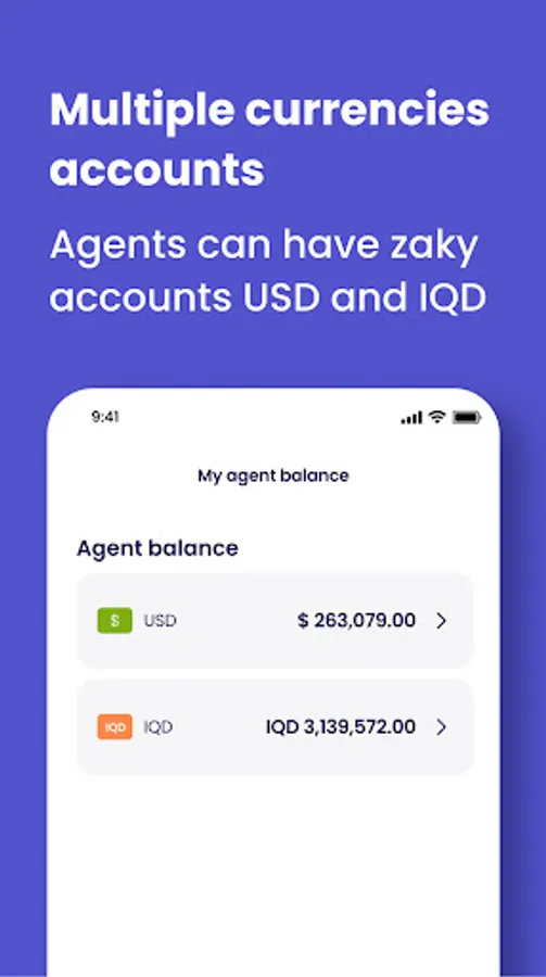 Agents can have zaky accounts in 2 currencies USD and IQD