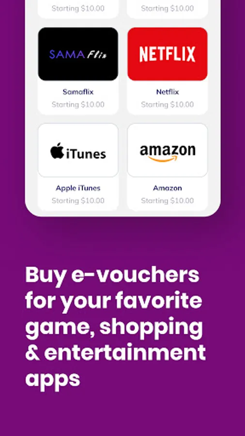 Purchase e-vouchers for your favorite gaming, shopping, and entertainment apps, such as iTunes, PlayStation, Xbox, Amazon, Netflix, and more.
