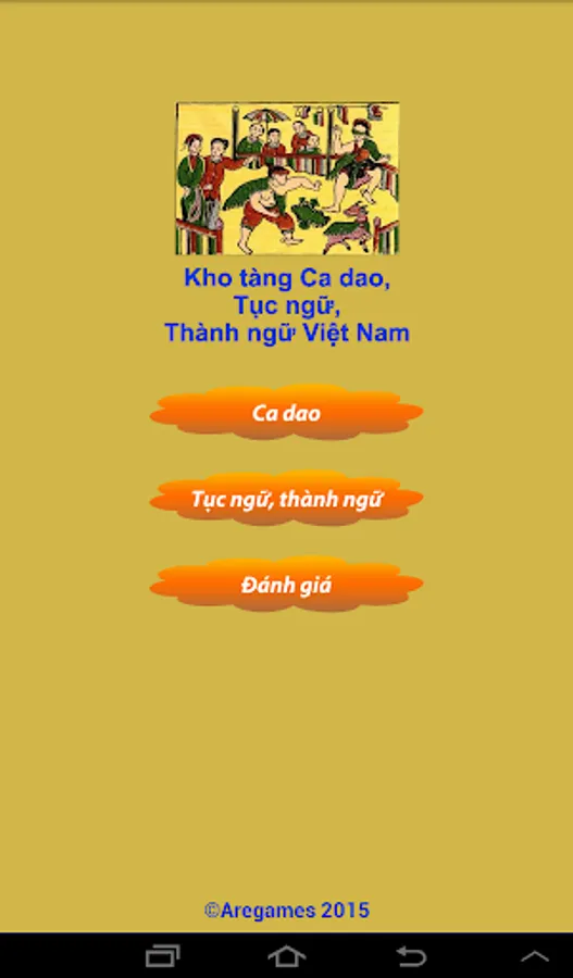 Kho Tàng Ca Dao (Ca Dao - Tục Ngữ - Thành Ngữ) – Tuyển chọn trên 10,000 bài Ca dao khắp ba miền Bắc, Trung, Nam và hơn 7,000 câu Tục ngữ, Thành ngữ Việt Nam phổ biến. Aregames dành tặng ứng dụng này cho tất cả các bạn yêu thích Văn học Việt Nam nói chung và yêu thích Văn học Dân gian Việt Nam nói riêng!