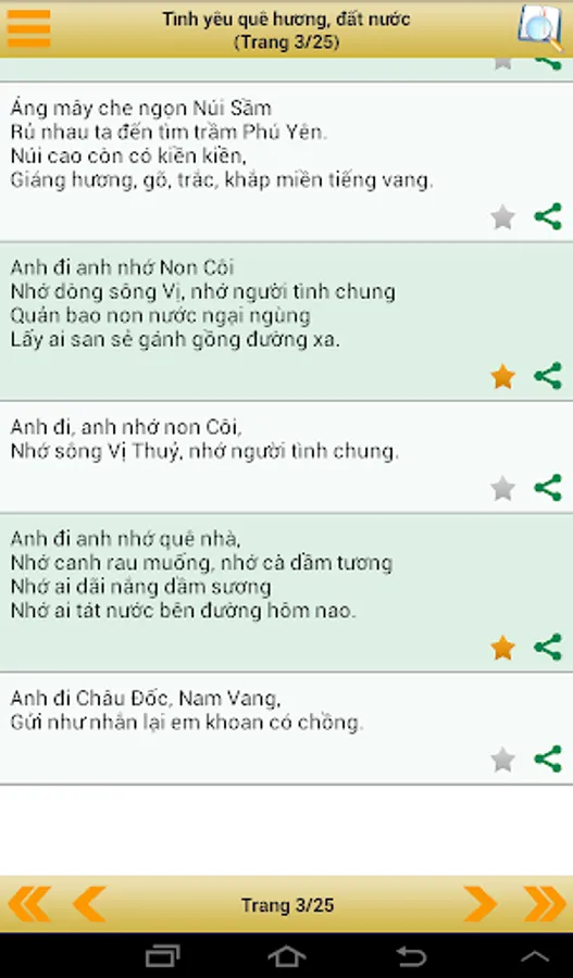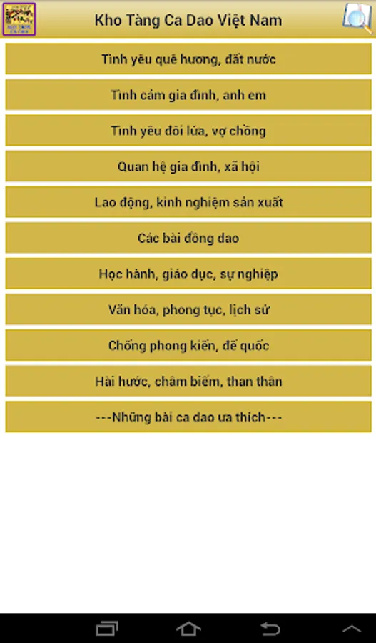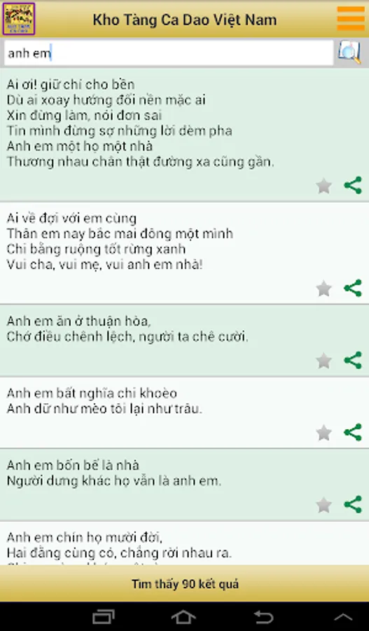 Kho Tàng Ca Dao có chức năng tìm kiếm, đánh dấu những bài Ca dao, câu Tục ngữ, Thành ngữ ưa thích & đồng thời cho phép bạn chia sẻ với bạn bè, người thân!