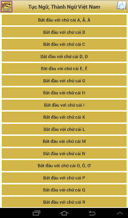 Phần Tục Ngữ, Thành Ngữ được chia thành các đề mục dựa theo bảng chữ cái Tiếng Việt (A, Ă, Â,...).