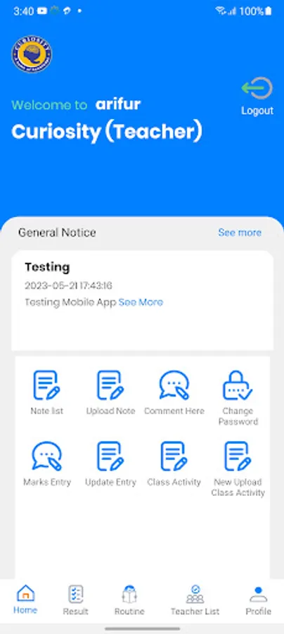 View profile: Profile will show the basic information about the teacher. Notice: Notice will give two option General notice & Personal Notice from School.