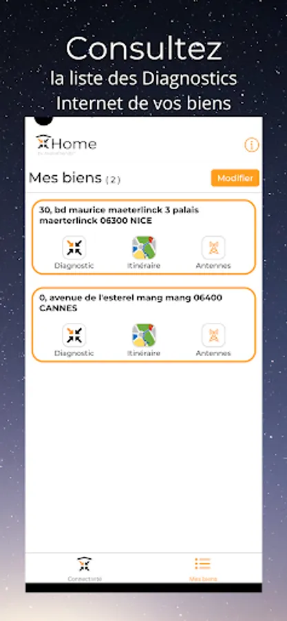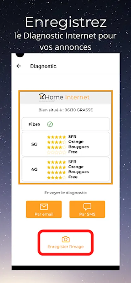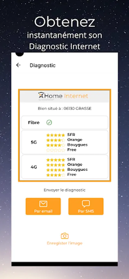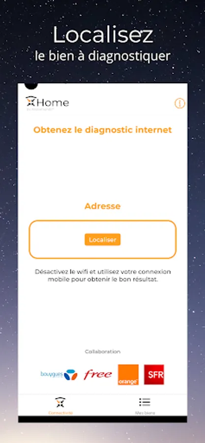The application is based on an expert algorithm analyzing different data sources of technical information on the deployment of fiber, the installation of 4G and 5G antenna networks of all the telecom operators in France closest to the property. The application provides you with an Internet Diagnosis in the form of a summary result understandable by all.