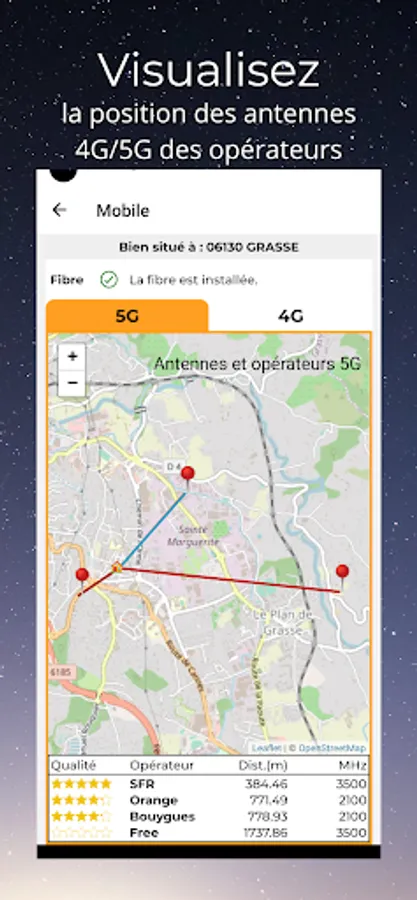 - 4G/5G antennas on map: view the 4G and 5G antennas of all the mobile operators closest to the property on an interactive map, with information on the frequency and the distance between the antenna and the property to choose the best operator .