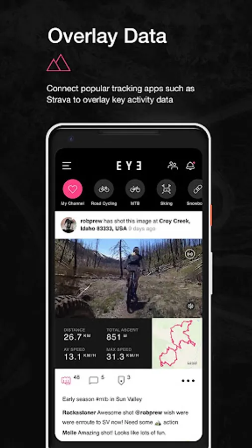 EYE lets you easily overlay key data from popular sports training and tracking apps which give your friends and community a new and unique context for your photos and videos.