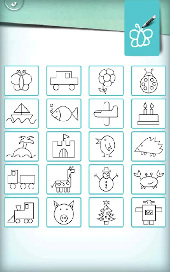 This application will teach your child to draw easily 20 different pictures like a butterfly, a snowman, a flower, a birthday cake...