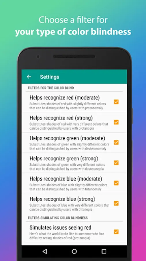 Simply put, it lets you see the world around you through a filter created precisely for your type of color blindness. You'll see details you hadn't notice before and you'll be able to take more interesting photos.