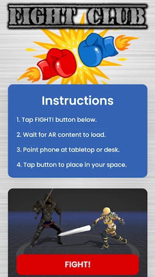 Choose your fighting characters, point your phone at the top of a table or desk and watch them battle! Move around the fighters and view from any angle. Hear the spatial sound effects of battle. Join the AR Fight Club today!
