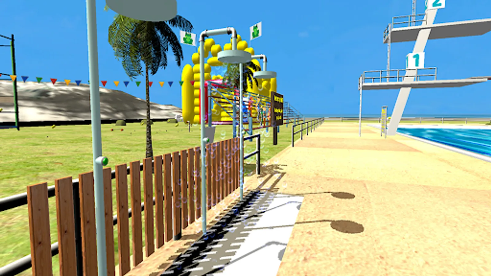 Summer Jumping VR, first person 3D and 360 VR game. Jump on Trampolines, jump in the Bouncy Castle, jump from the Diving Tower in to the swimming pool, or Bungee jump from the Bungee Crane Platform.