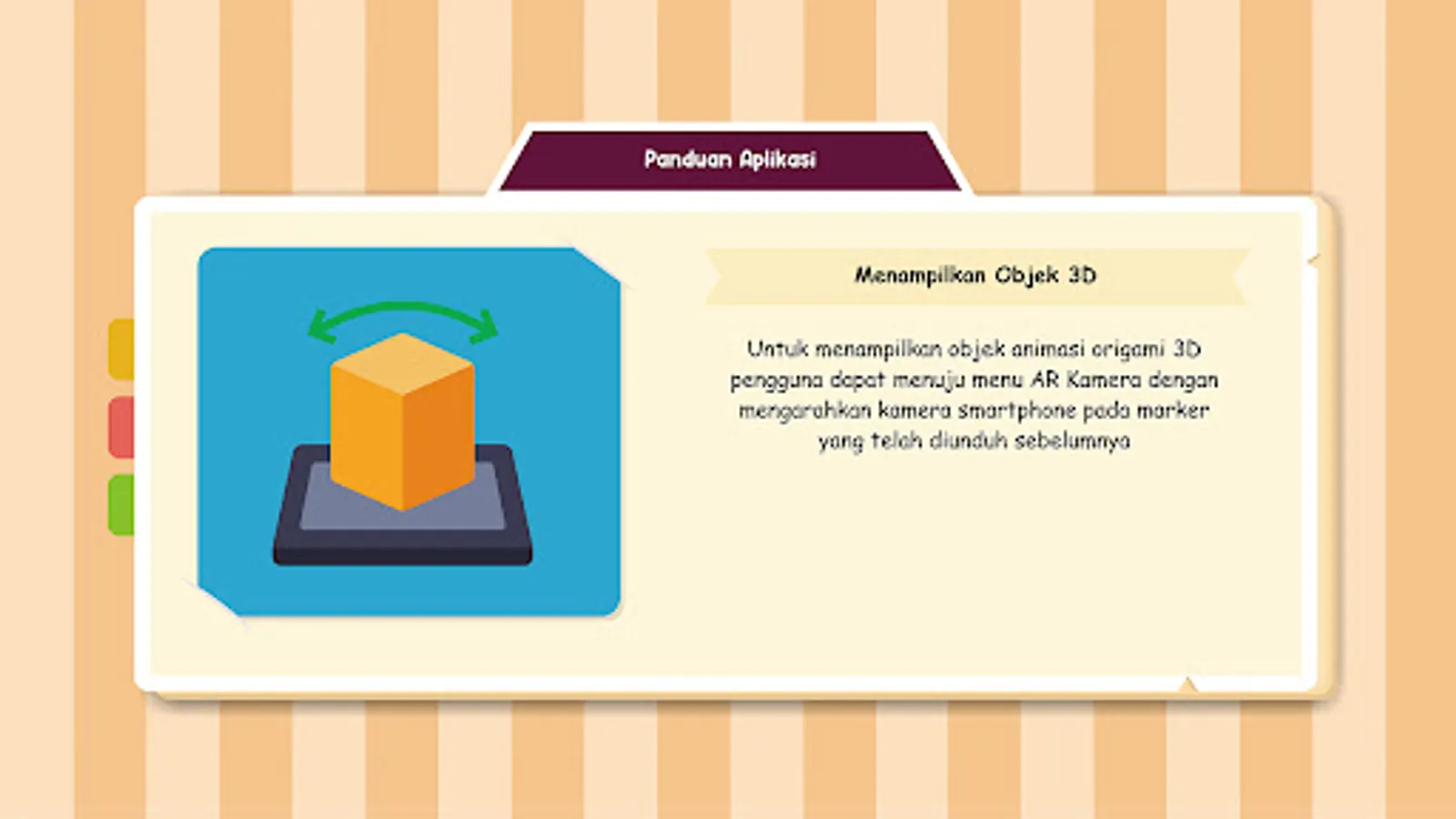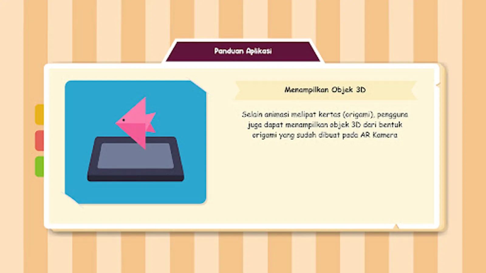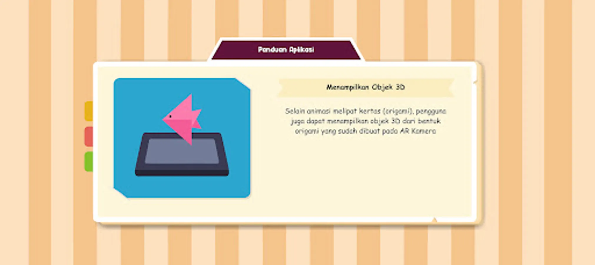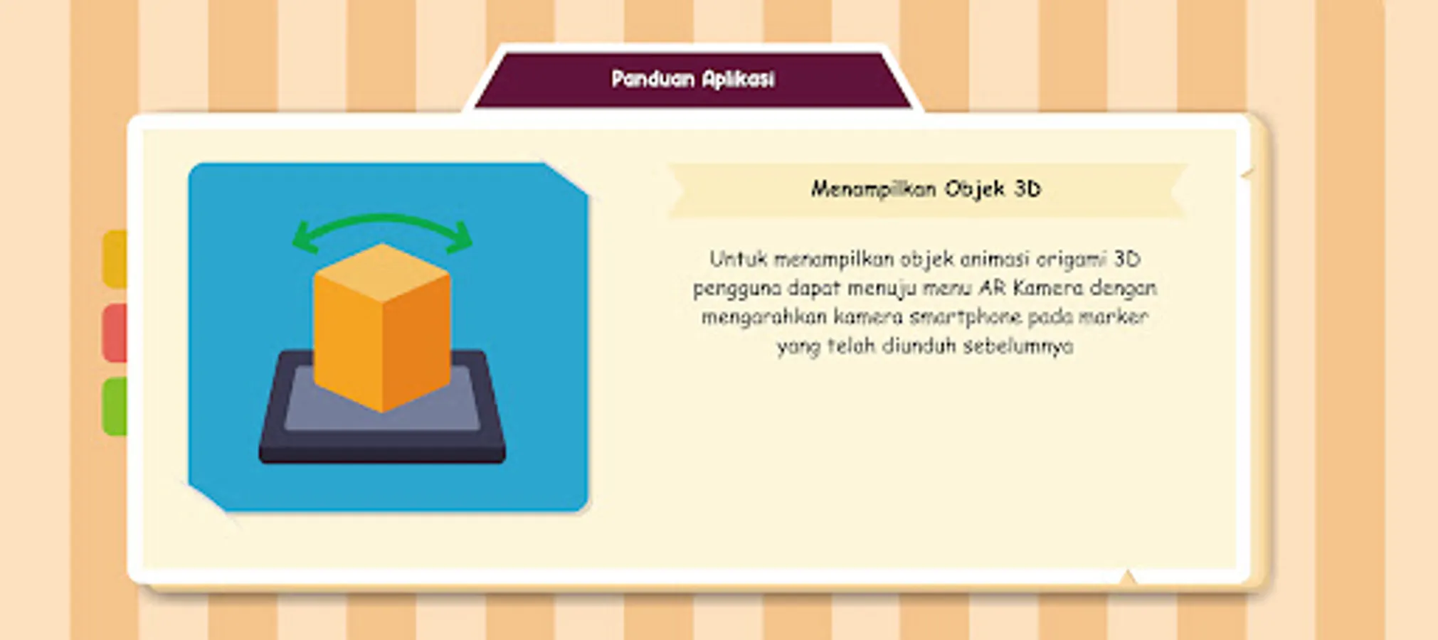 ARGAMI 3D is an origami learning media application aimed at children aged 2-6 years. This application uses augmented reality technology, where children can learn to make origami with 3D animated visual displays and interactive menus