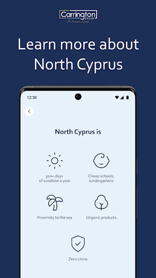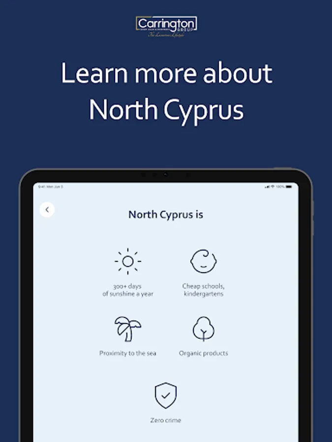 Download the app, select the dates that are convenient for you, answer questions from a company employee and take advantage of a free 3-day trip to Cyprus to get acquainted with Carrington Group properties. You will receive the maximum information needed to make a decision to buy a home in Northern Cyprus.