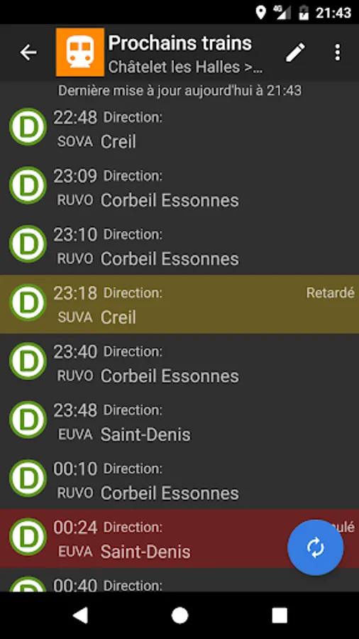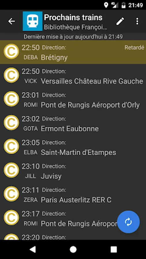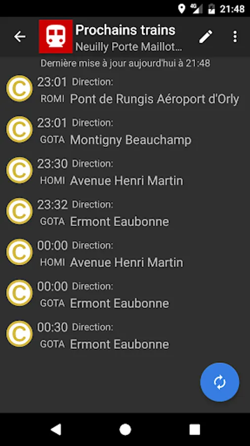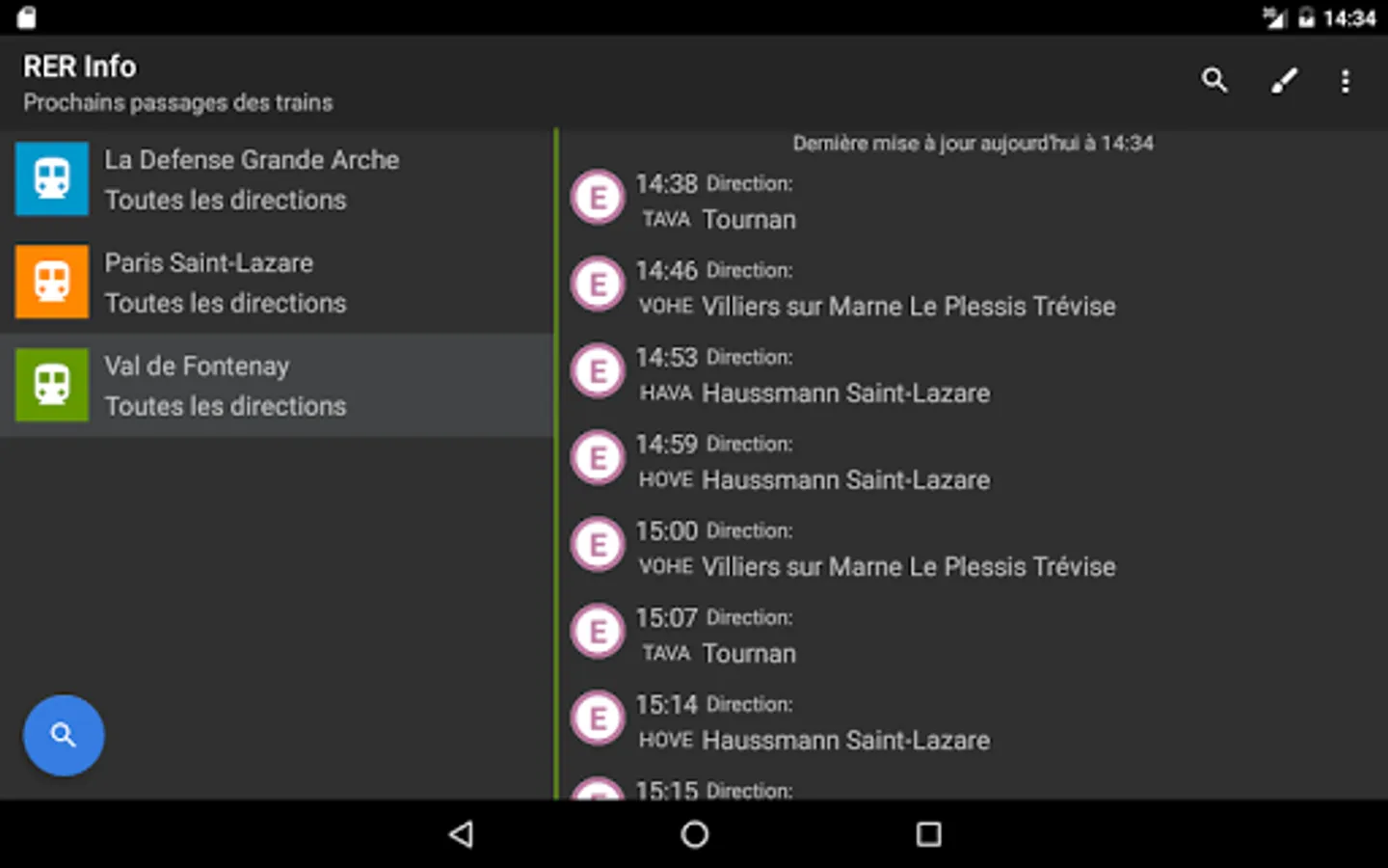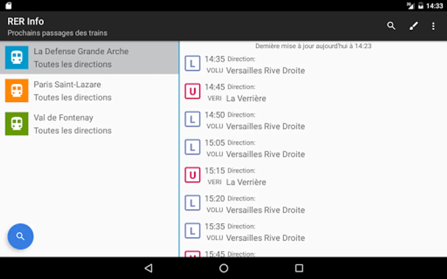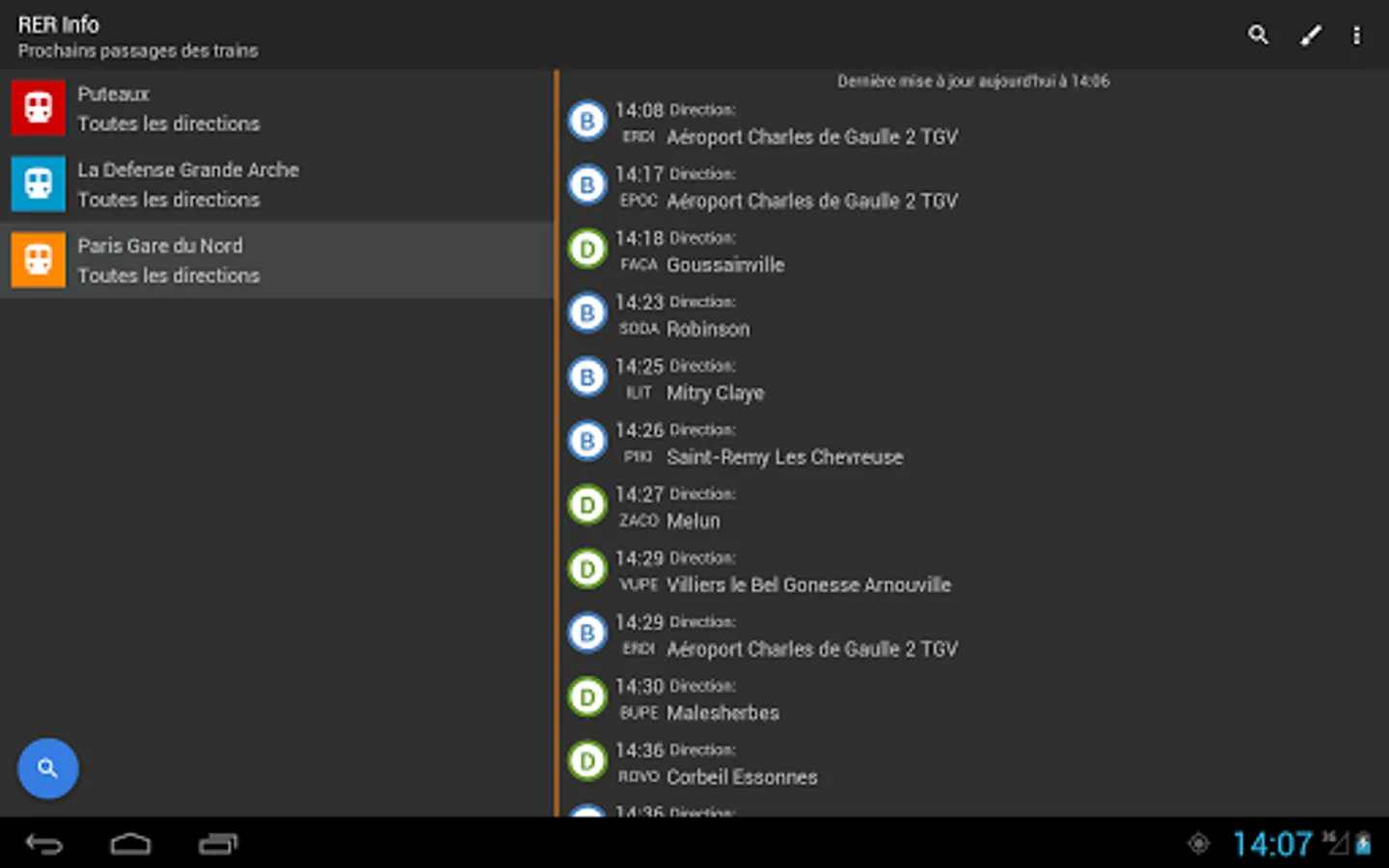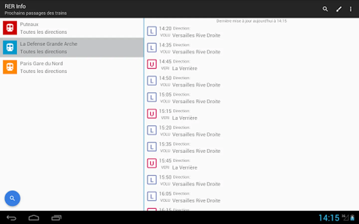 Except for RER A and B, this application allows you to search the times of upcoming trains RER C, D, E, as well as suburban trains H, J, K, L, N, P, R and U passing at the station of your choice, in real-time, in all the region of Île de France.