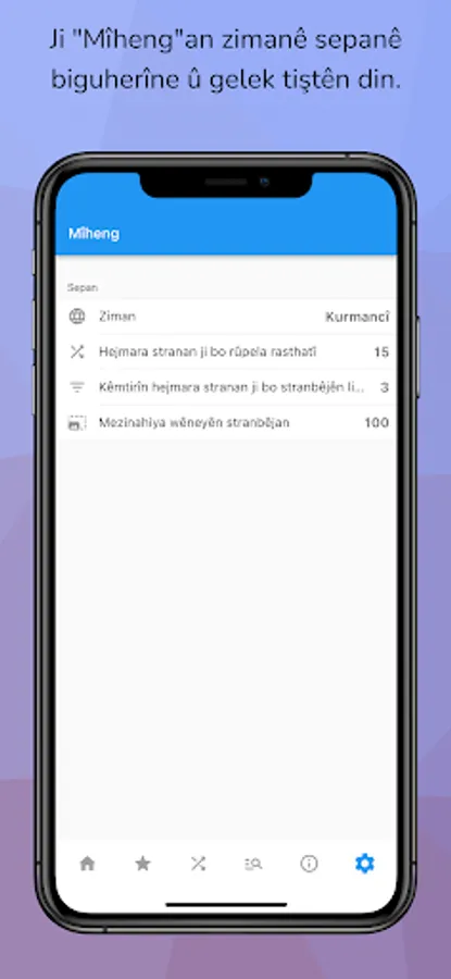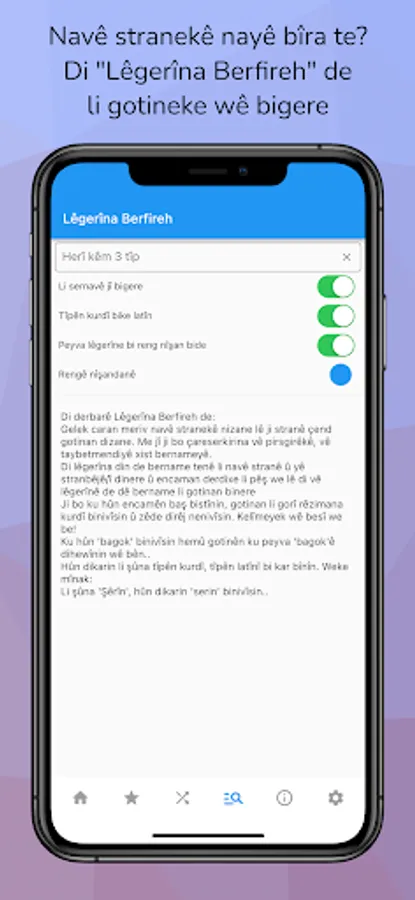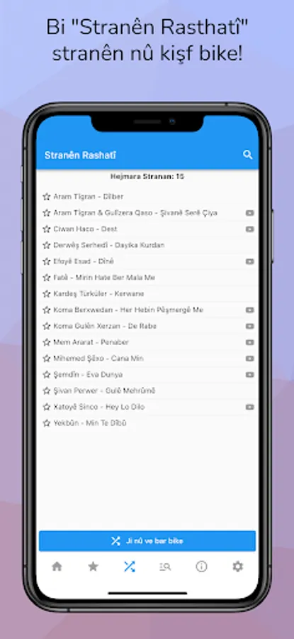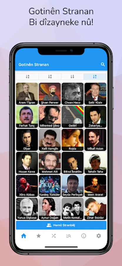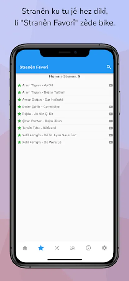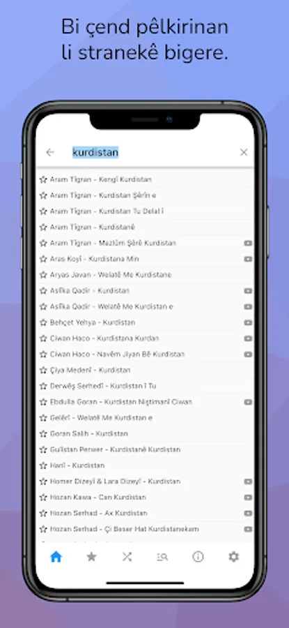 Di sepanê de nêzî 7000 zêdetir gotinên stranan û ji 800î zêdetir stranbêj hene. Bi lêgerîna berfireh mirov dikare di nav gotinên stranê de jî lêgerînê bike. Ku bikarhêner ji stranekê hez bike dikare wê stranê bike favorî an jî parve bike.