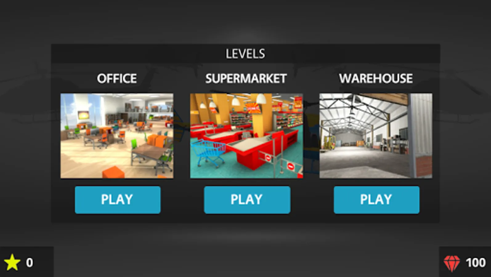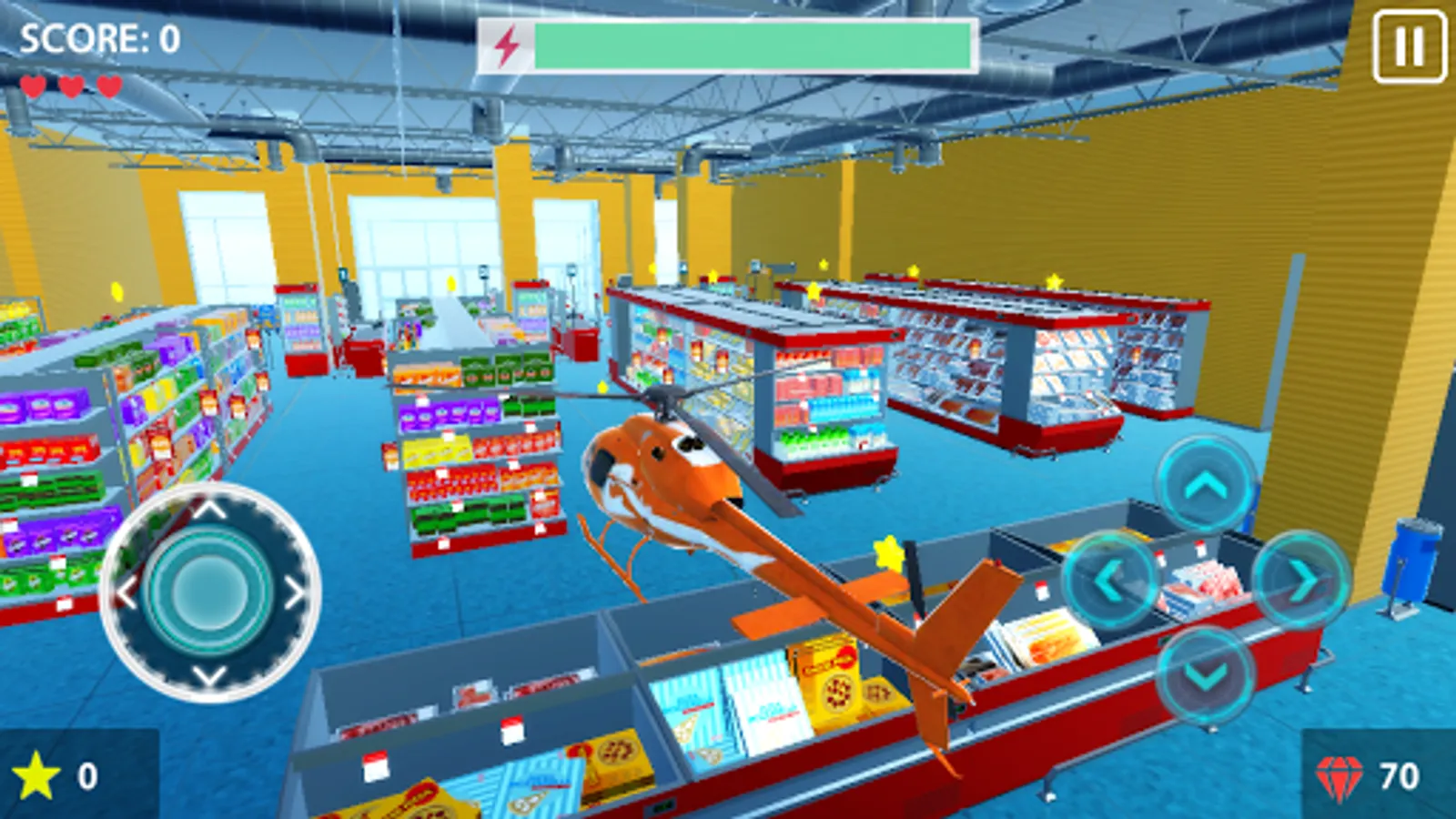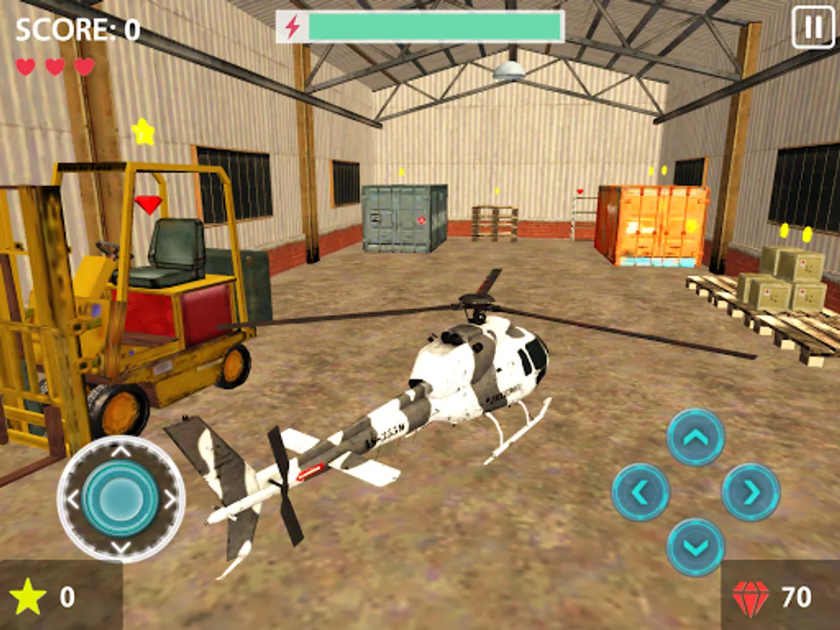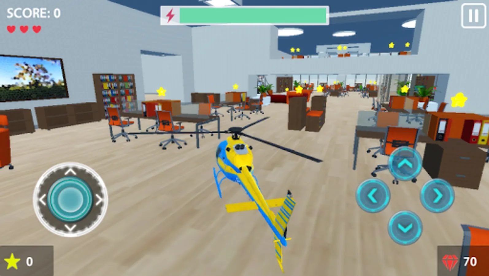 Fly remote controlled helicopters and collect stars at three different places: Office, Supermarket and Warehouse.