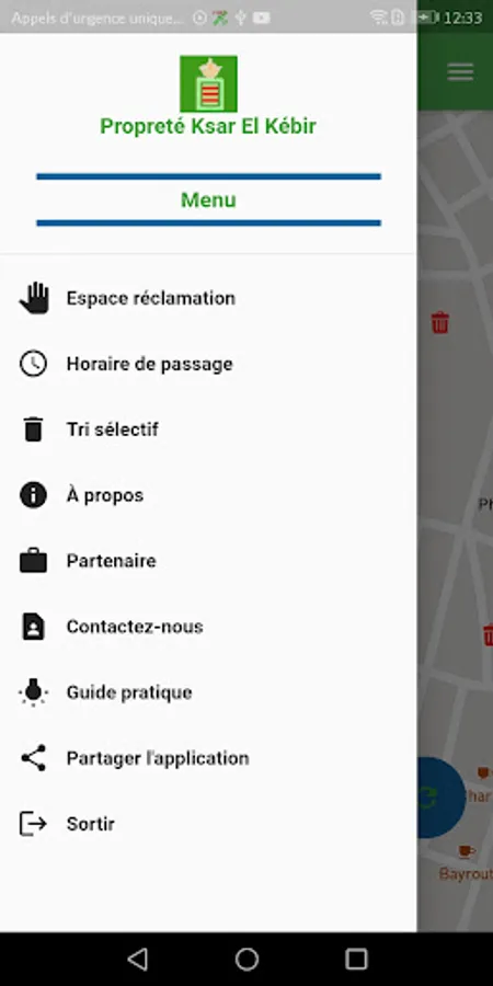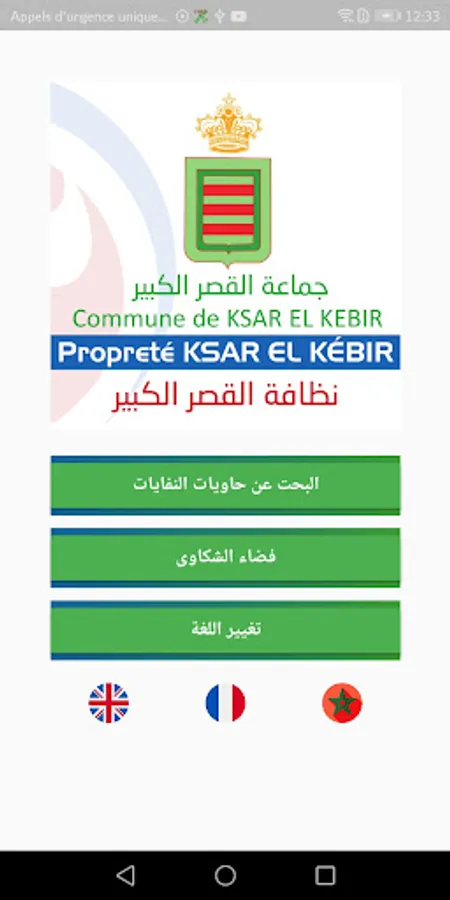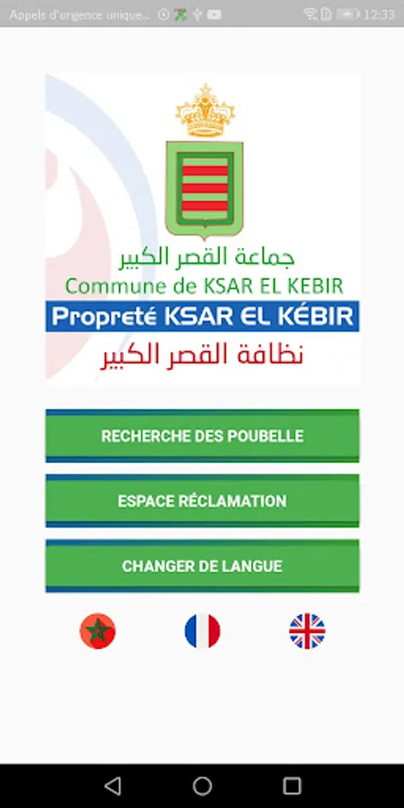 Propreté Ksar El Kébir is a mobile application developed by ATS which firstly allows its users to locate the nearest street furniture by displaying a map of the city based on the current geographical position of each user, it also allows complaints to be reported. observed on the state of the public road, by attaching a photo of the anomaly taken in real time through the application as well as the description and the geographical position of the latter, this report will then be automatically sent to the officials of the municipality concerned and then to the delegated cleaning service provider to process it.