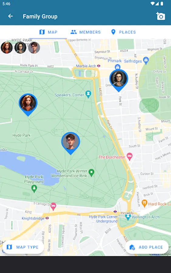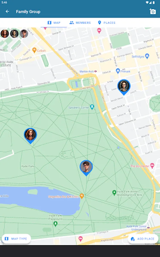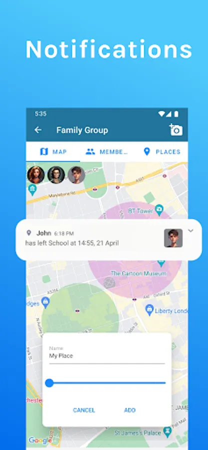 You can define custom places and get notifications when family member enters or leaves them. You can also control notification sound, vibration or whether you see them at all.