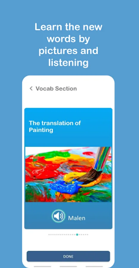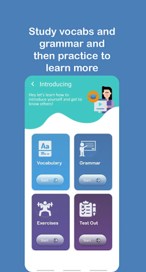 Users can learn vocabulary by observing pictures and listening to their pronunciations, which is one of the best methods to learn and memorize new words. There is also the grammar section which provides data for learners to learn how to use the learned words. Another section of the app is the exercise section which allows learners to practice what they have studied in the vocabulary and grammar section.