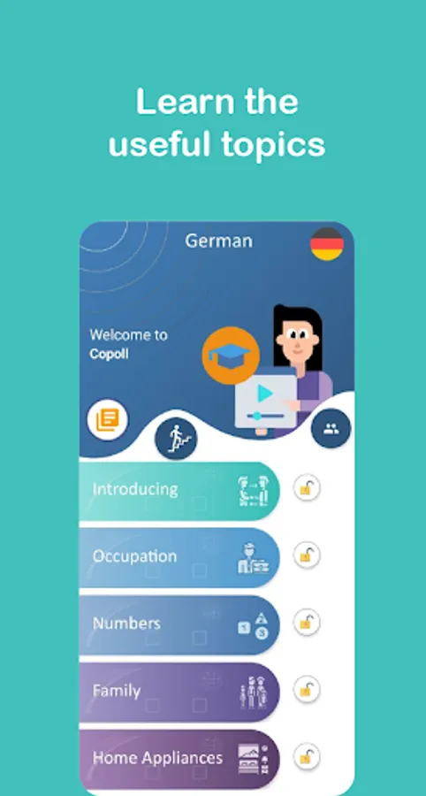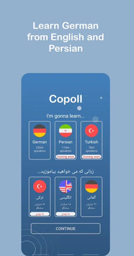 Copoll is built to prepare an environment for users to learn new languages. This is the first version of this App and users can learn German language so far, but it will cover English, French, Turkish, Farsi and etc in the near future. The users can learn these languages from English and Farsi so far and in future updates, users will be able to learn from more languages.