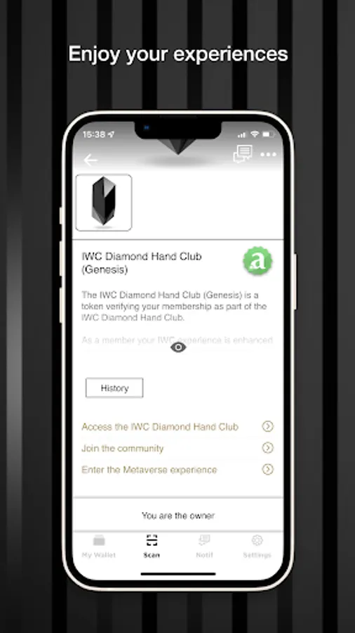 Interact with the IWC community in a whole new way with seamless access to exclusive IWC events and experiences in the metaverse and the real world. The highly exclusive IWC Diamond Hand Club will enhance your IWC experience with intangible values, merging the physical world with the digital one, and connecting you as an individual collector with the community of watch and NFT enthusiasts worldwide. Get yourself a membership NFT with one of the limited Diamond Hand Club tokens and let us welcome you to the club.