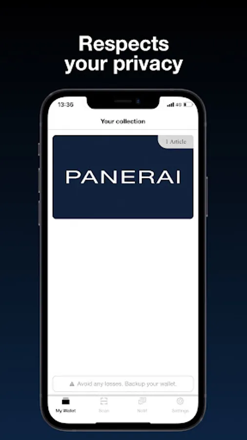 The Panerai Digital Wallet is a unique cryptographic wallet developed by Arianee, allowing its owners to store and truly own their non-fungible tokens. Built upon web3 infrastructure, the Panerai Digital Wallet allows complete control of personal data without tracking.