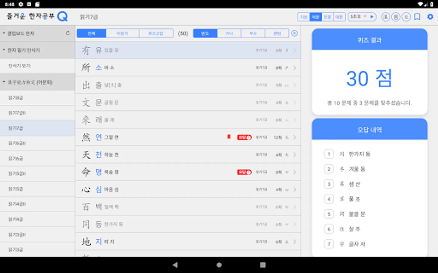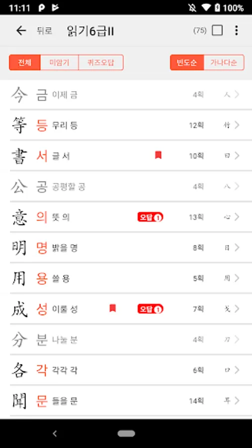 * 한자퀴즈 오답노트 (틀린 횟수, 틀린 한자 목록)