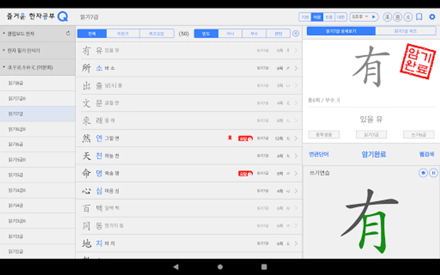 * 한자능력검정시험(어문회), 한자자격시험(진흥회), 한자급수자격검정시험(대한검정회) 급수별 한자 지원 (6급 이상의 상위 급수는 프리미엄 기능)