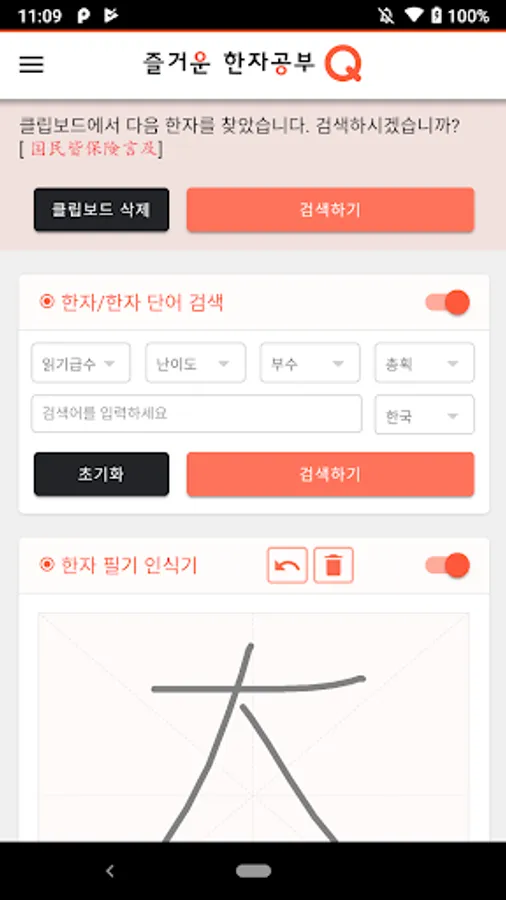 * 한자 독음/훈음 및 한자 단어 검색 지원