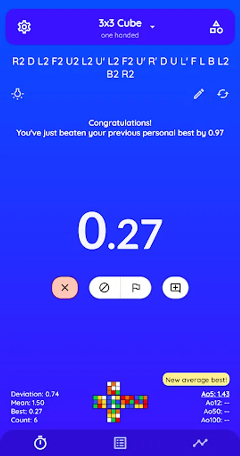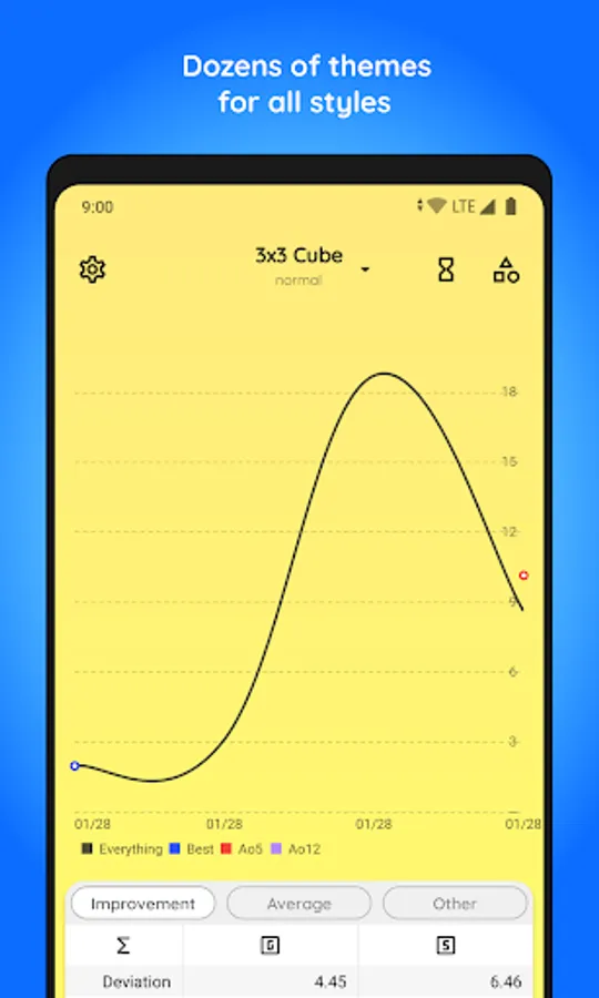 Dozens of statistics for each puzzle and category. Track your best and worst single and average times, get alerted of new personal bests, visualize your averages of 5, 12, 50, 100 and 1000 in a graph, and track many more statistics like total time, deviation and solve count.