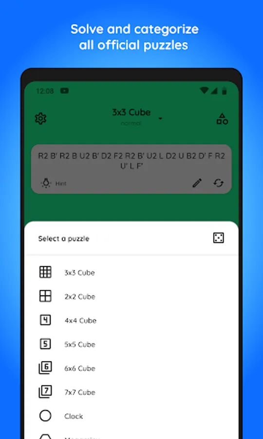 • Random-state scrambles for all official puzzles, like the 3x3, 4x4, Megaminx, Pyraminx and others, with a visual representation of each scramble