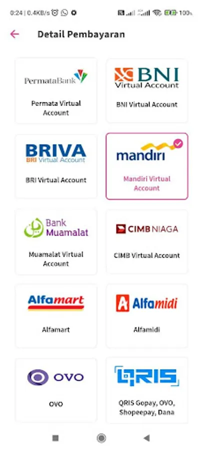 We provide many choices of payment methods such as E-Wallet: BCA Mobile, OVO, ShopeePay, GoPay, Dana, LinkAja; Virtual Accounts: BCA, BNI, CIMB, Mandiri; Mini Markets: Indomaret, Alfamart, and Alfamidi.