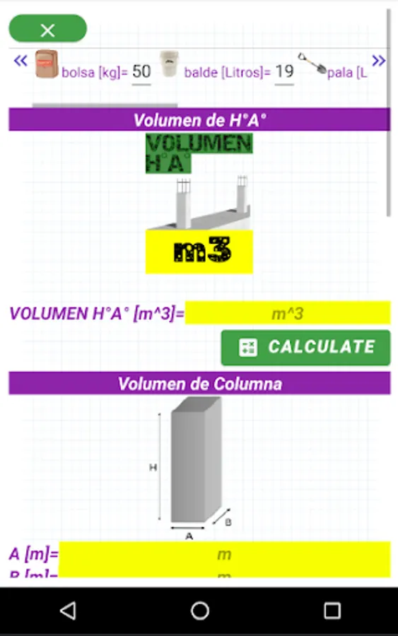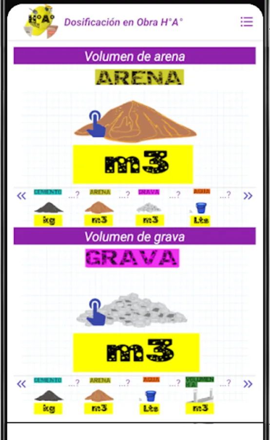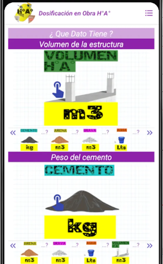 - The application asks you for an input data that you have on site, it can be the data of volume of gravel or volume of sand or weight of cement or volume of the structure.