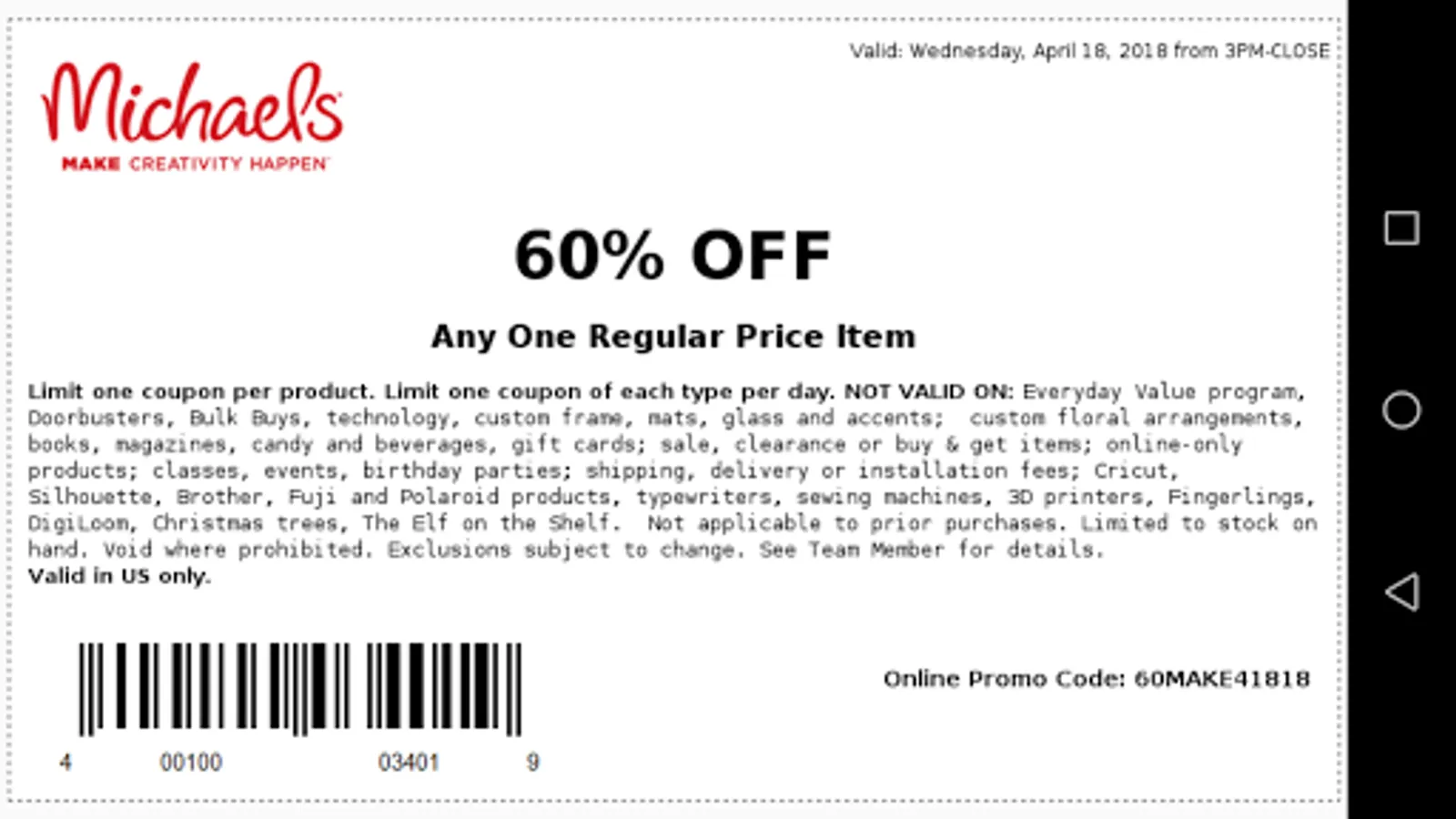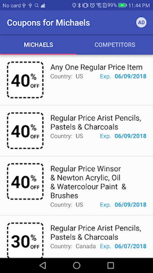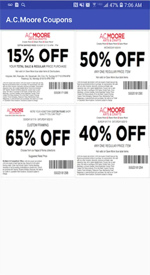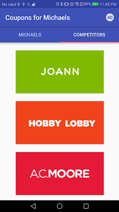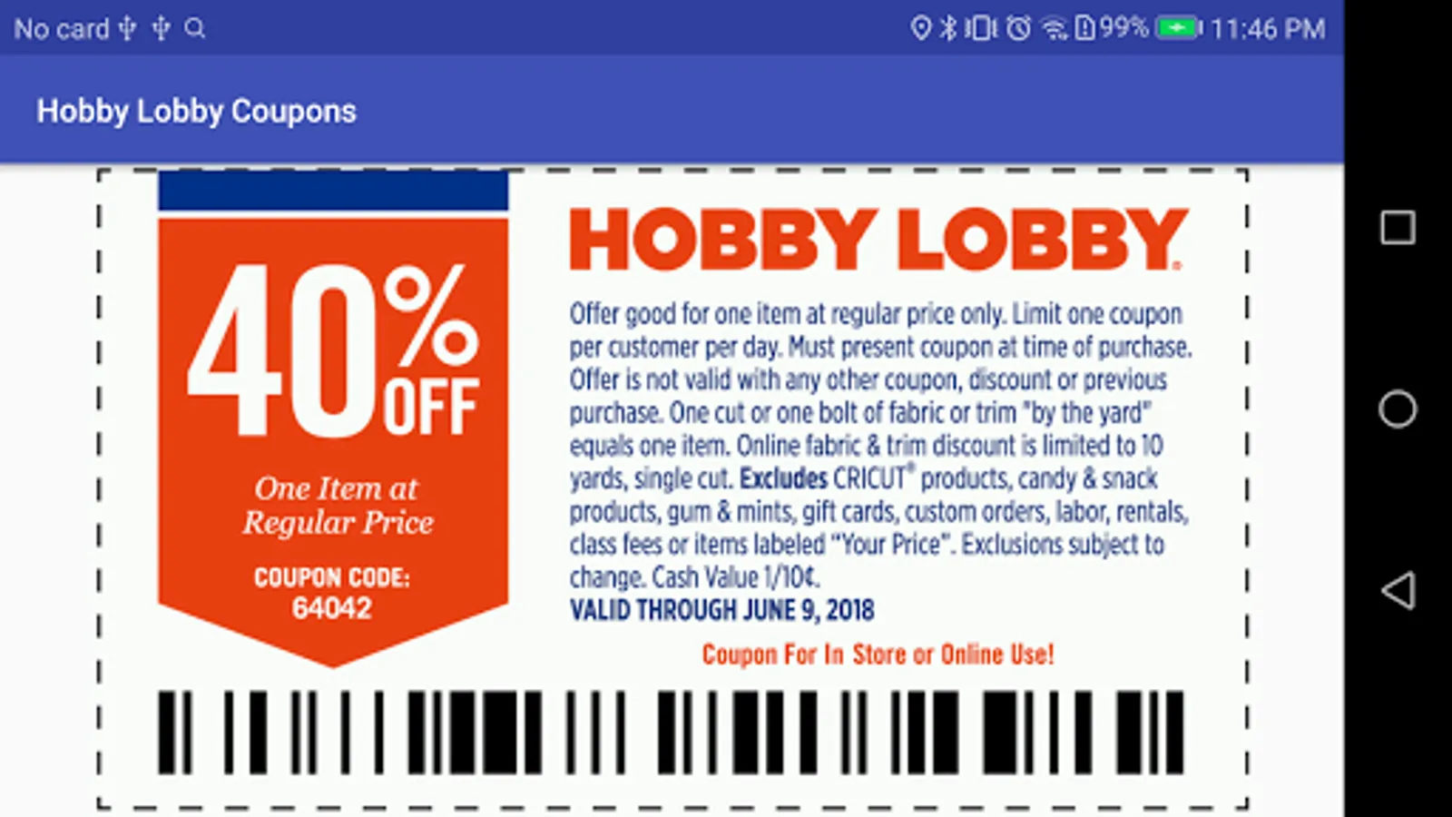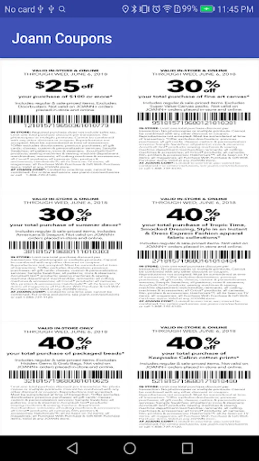 This app includes the competitor's coupons, Joann coupons, Hobby Lobby coupons, and A.C. Moore coupons.